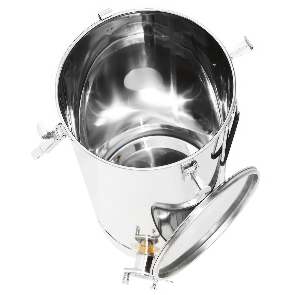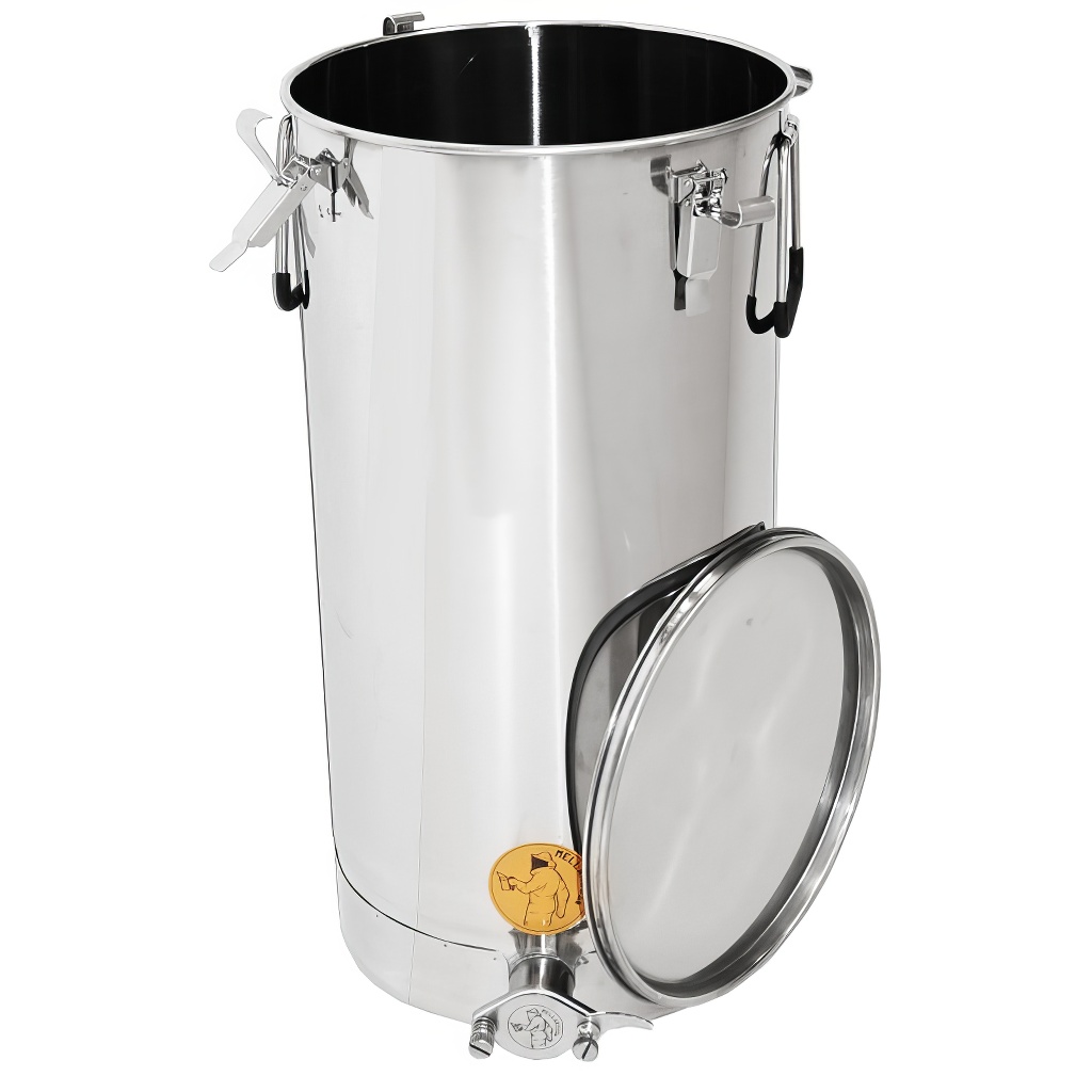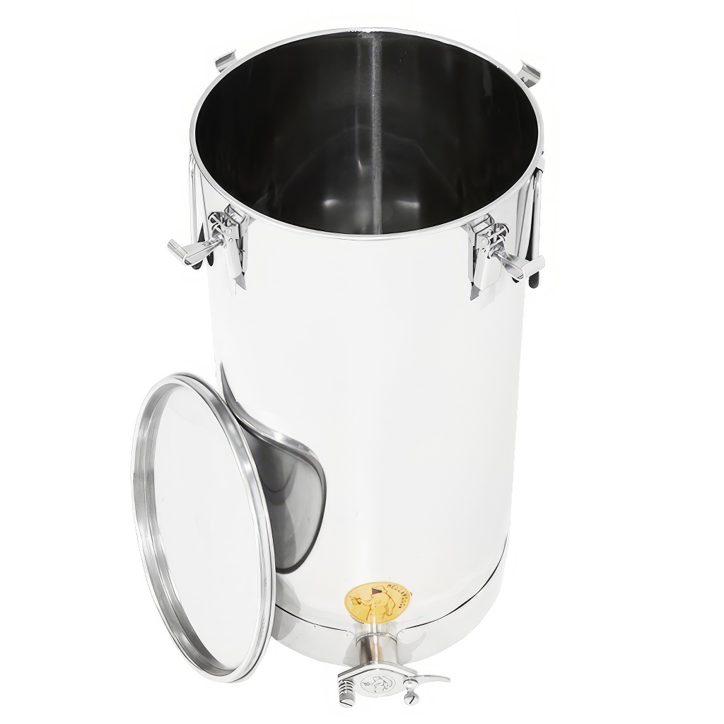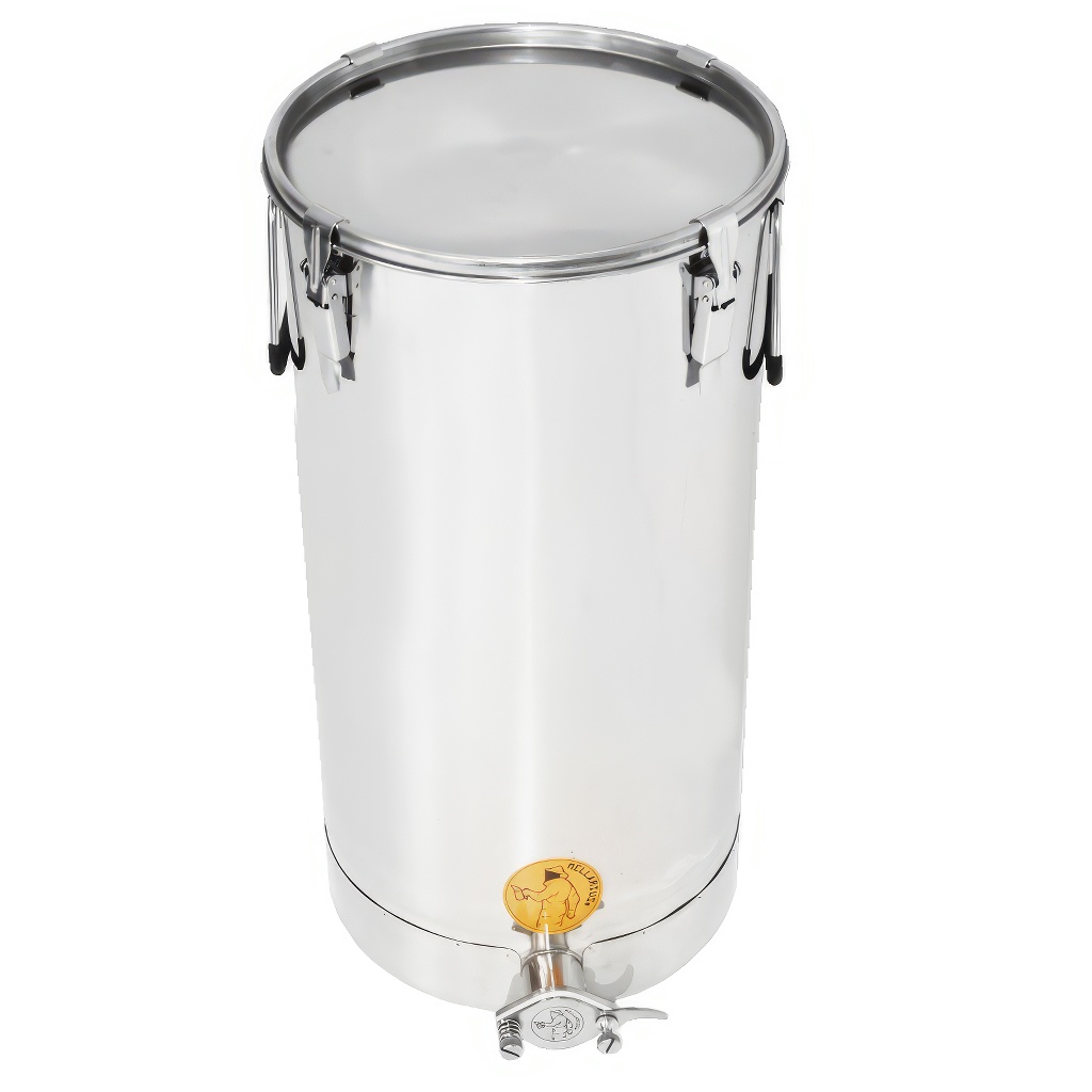 Honigbehälter Mellarius in mehreren Varianten, in diesem Fall mit geneigtem Boden, Dichtungsdeckel und angeschweißtem Edelstahlhahn für maximale Festigkeit. Sie werden aus hochwertigem Edelstahl hergestellt, der für Lebensmittelzwecke geeignet ist und eine ausreichende Stärke (0,8 bis 1 mm) aufweist, damit es nicht einfach zu ungewollten Verformungen kommen kann. Alle Teile der Behälter sind hochwertig mit Hilfe von Plasmaschweißen verschweißt. Bei der Konstruktion wird Wert auf glatte Oberflächen gelegt, die sich leicht reinigen lassen, daher sind die Behälter aus polierten Edelstahlblechen hergestellt. Alle unsere Behälter sind mit Edelstahlgriffen für einfaches Tragen ausgestattet.