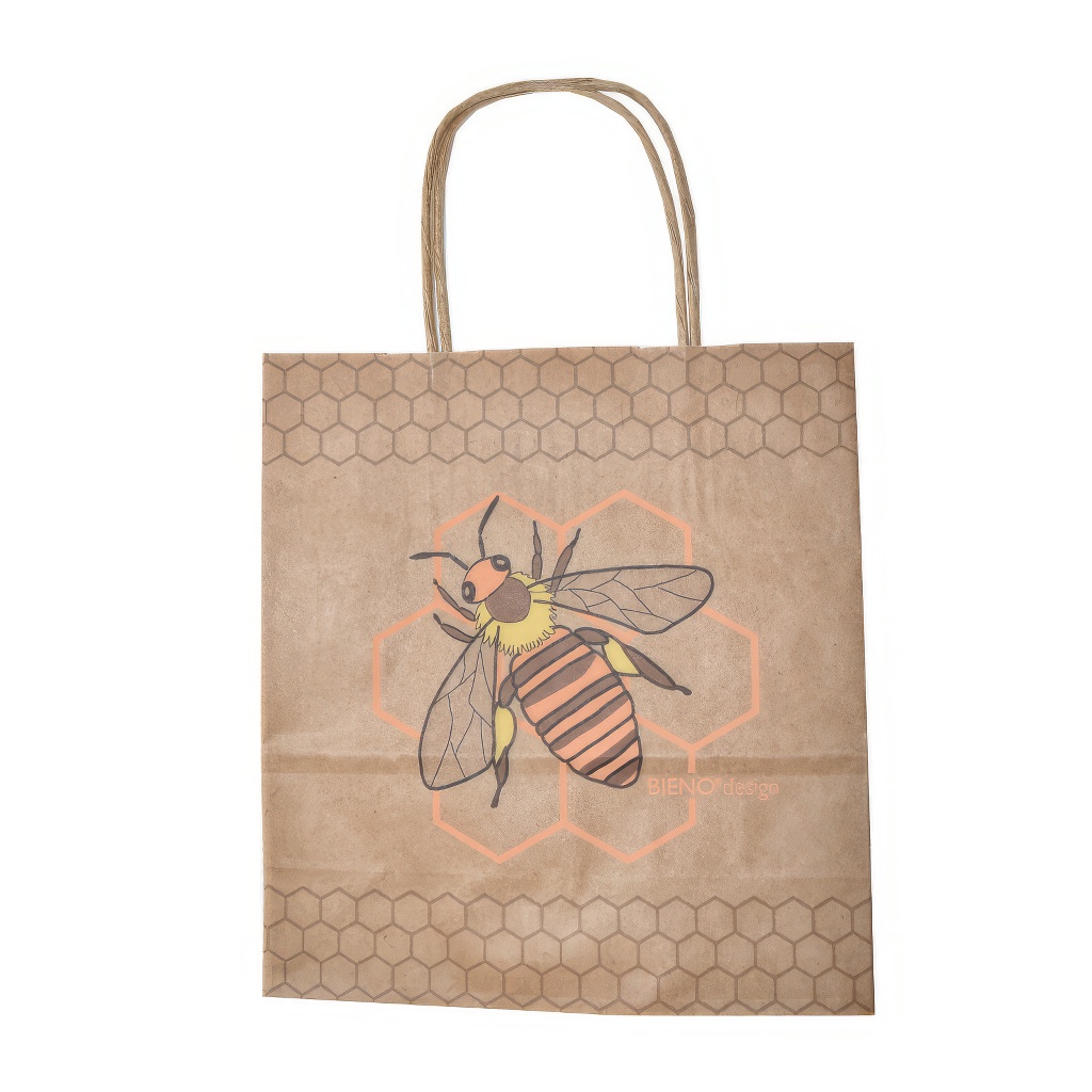 Papier-Geschenktüte in kleiner Größe mit Bienenmotiv. Größe ca. 18x8 cm, Höhe der Tüte 22 cm.