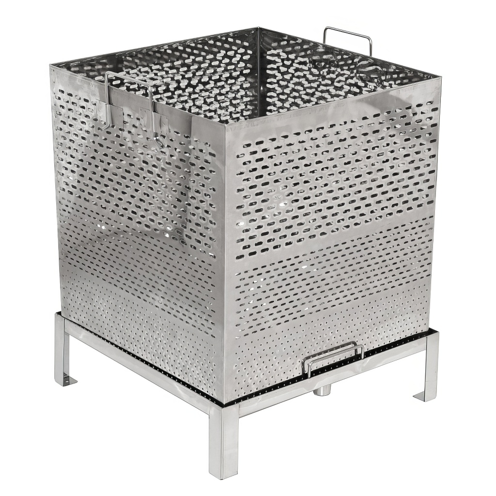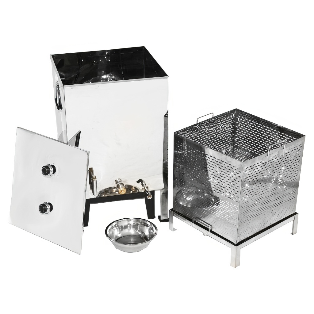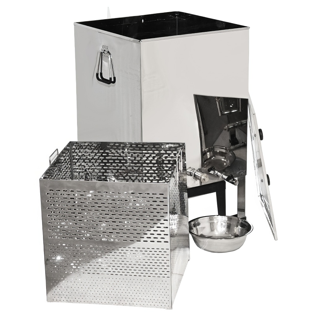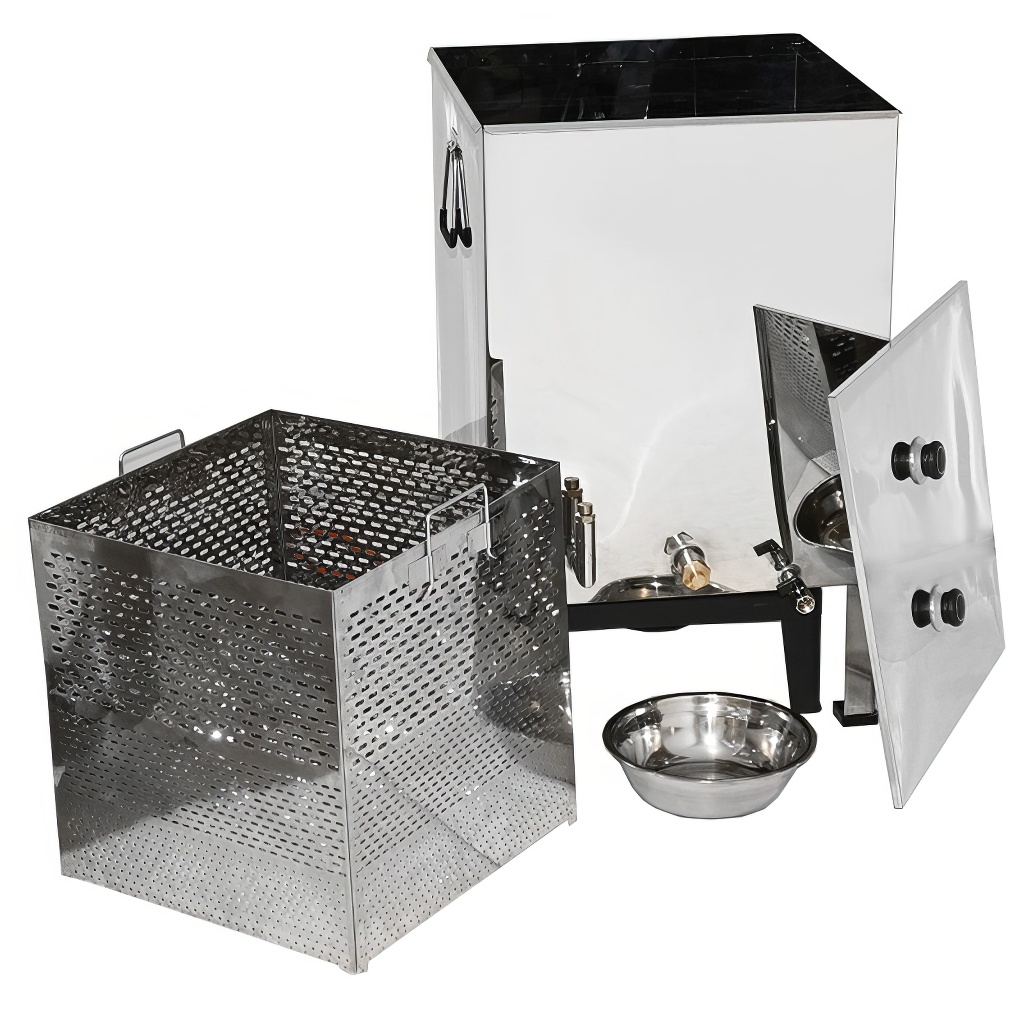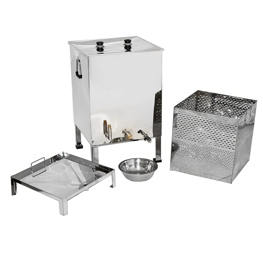 Hochwertiger großer Wachsschmelzer für einfaches und schnelles Ausschmelzen von Wachs aus Rähmchen und Wabenbau mittels Wasserdampf, der sowohl mit einem Dampferzeuger als auch mit einem Gasbrenner erhitzt werden kann. Der Dampf-Edelstahl-Wachsschmelzer besteht aus einem Wassertank und einem Korb für Rähmchen oder Wabenbau. Der Schmelzer hat ein stabiles 4-Bein-Gestell und einen Rähmchenkorb mit Griffen. Das Wasser fließt durch eine eigene Ablauföffnung ab und das Wachs ebenfalls.
