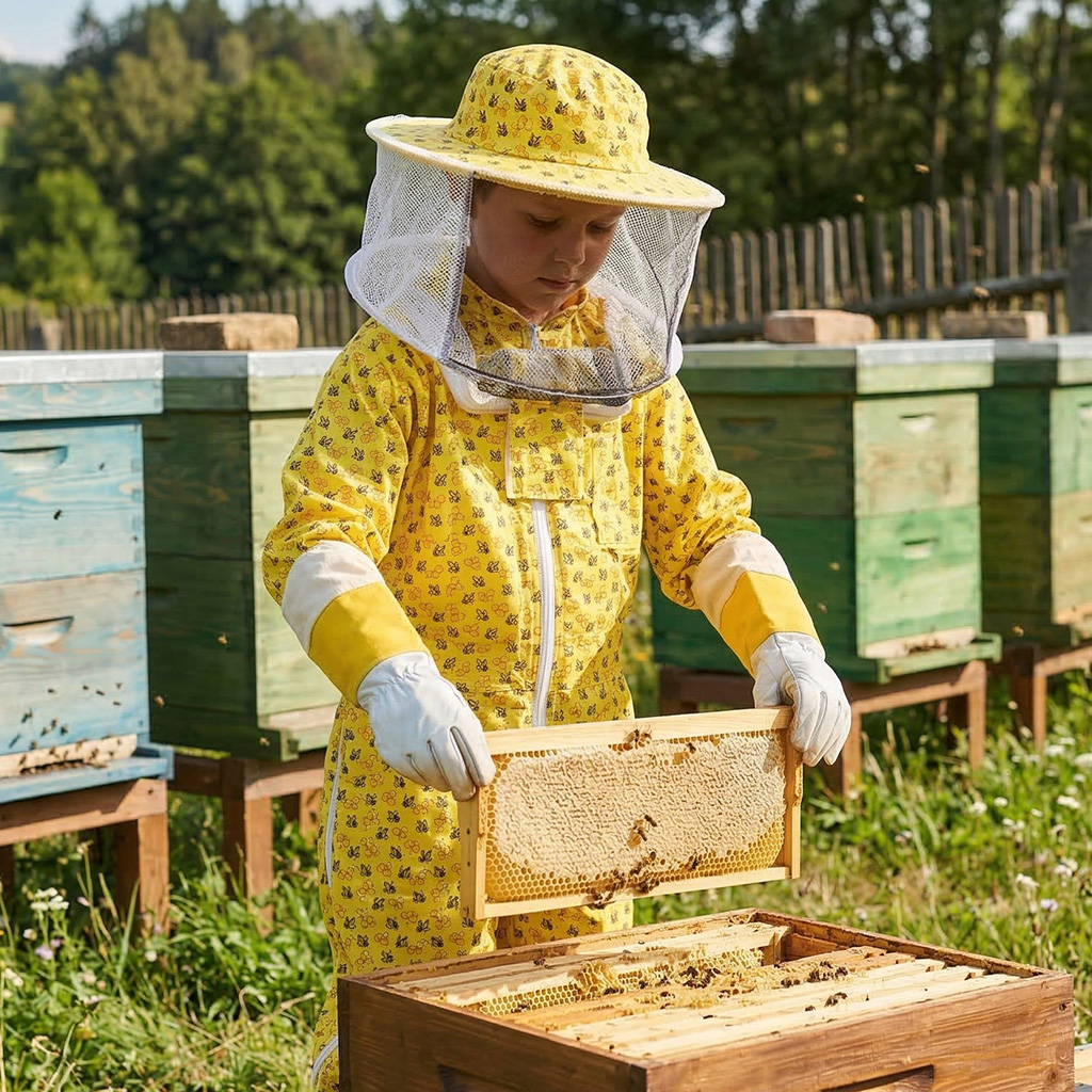 Imkeranzug mit Schleier für den täglichen Gebrauch am Bienenstand. Diese Anzüge haben viele Verbesserungen und gehören zum Besten, was wir Ihnen anbieten können. Für unsere kleinen Imker haben wir die Schutzanzüge Mellarius noch weiter verbessert, für ihre eigene Sicherheit. Alle exponierten Stellen sind gegenüber anderen Anzügen mit einer zusätzlichen Verstärkungsschicht verstärkt. Zum Schutz im Kopfbereich wird ein noch widerstandsfähigeres Material als üblich verwendet.