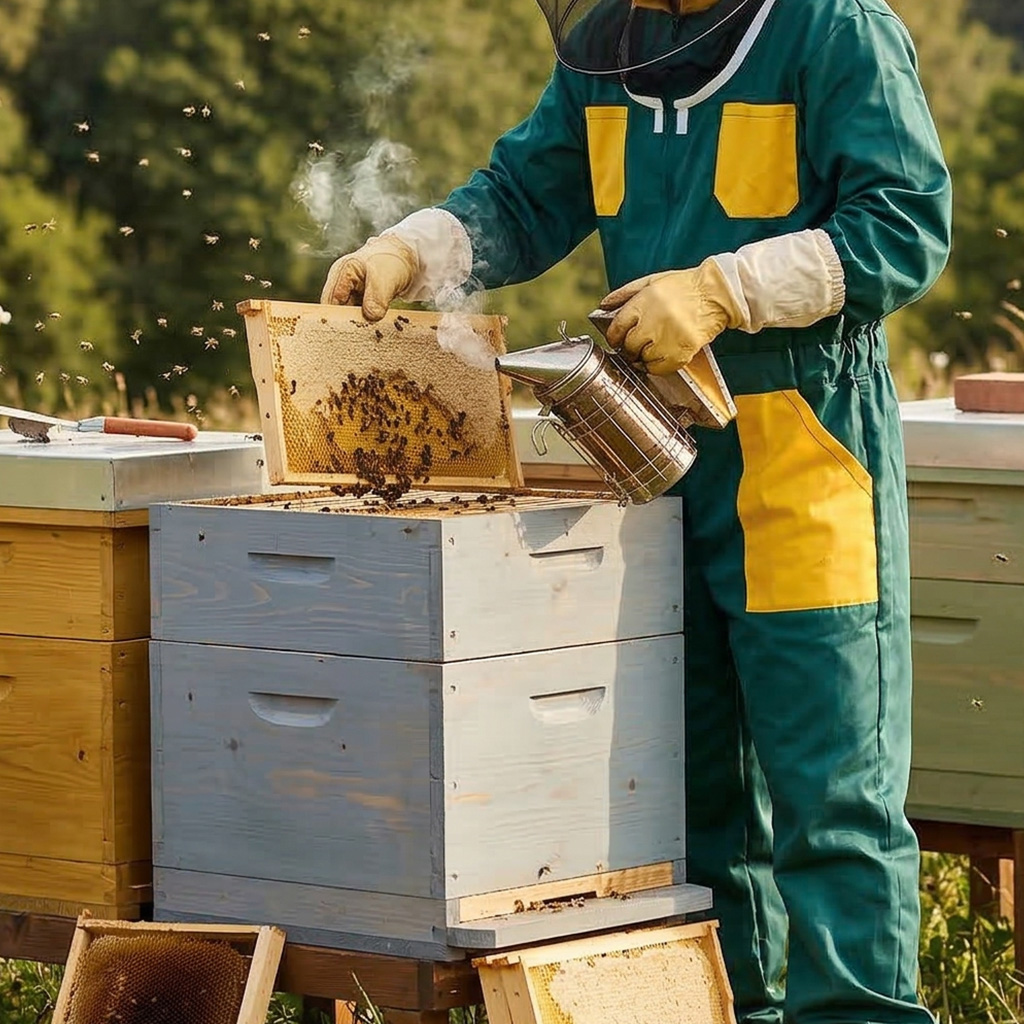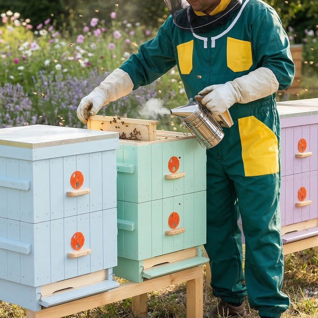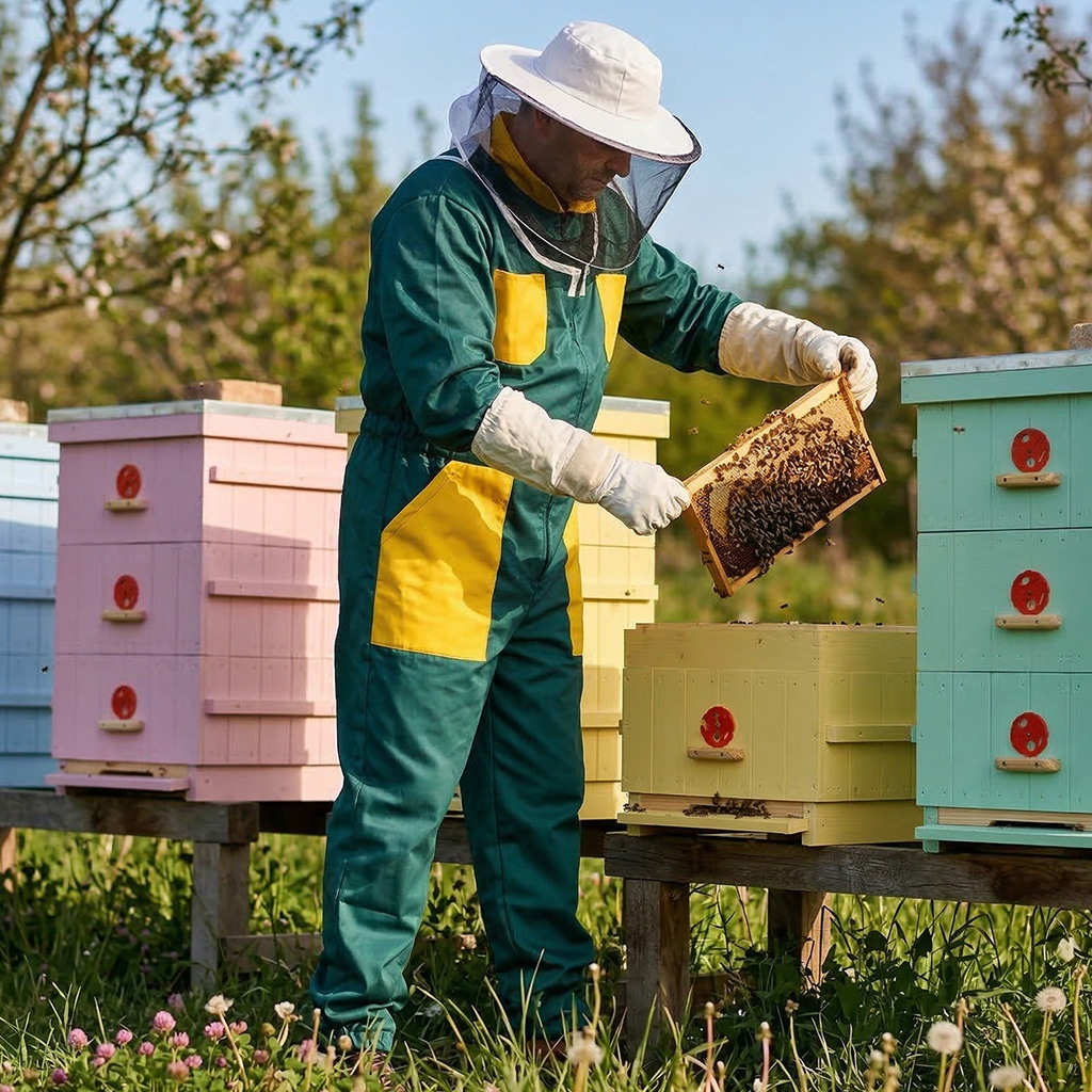 Der Imkeranzug ist aus festem Baumwollgewebe genäht, der untere Teil der Jacke