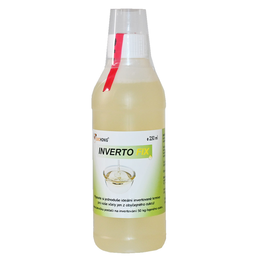 INVERTOFIX bringt Innovation in den Bereich der Bienenfütterung – es stellt ein hochwirksames enzymatisches Präparat zur Herstellung von Invertzuckersirup aus gewöhnlichem Zucker dar. Dank natürlicher Enzyme (aus Hefen Saccharomyces cerevisiae) ermöglicht es eine schnelle und sichere Umwandlung von Saccharose in Glukose und Fruktose, wodurch ein für Bienen leicht verfügbares und natürlich verdauliches Futter entsteht, das den optimalen pH-Wert beibehält und maximal schonend für ihre Verdauung ist.