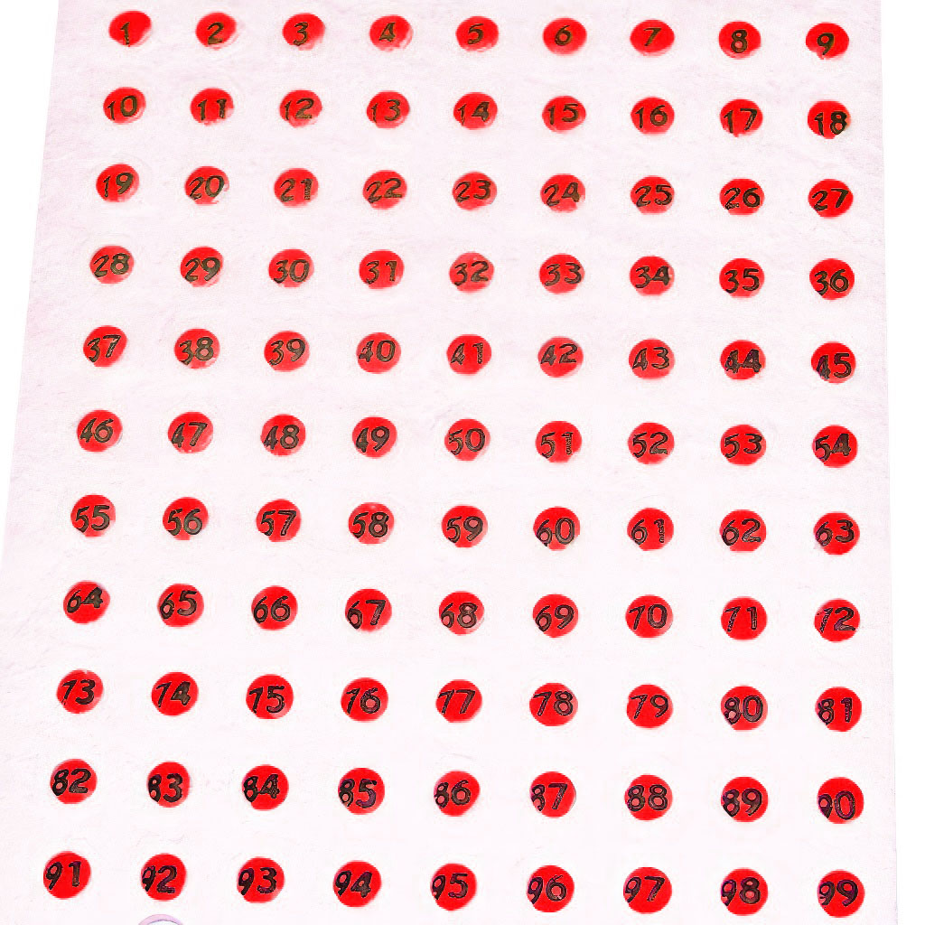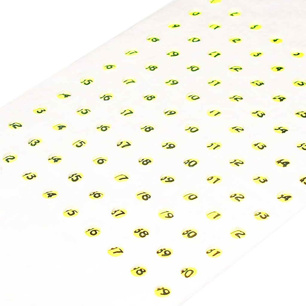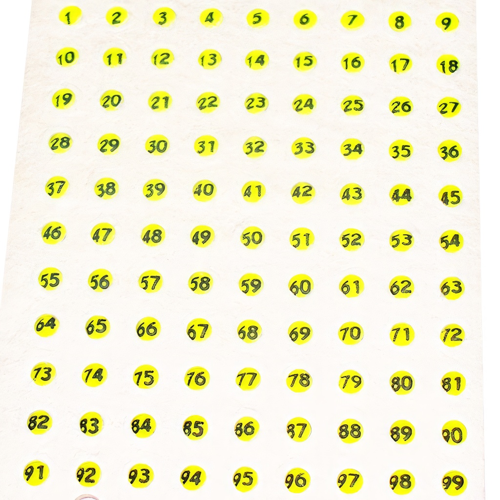 Moderne Art der Königinnenzeichnung. Kleine Plättchen mit aufgedruckten Zahlen in farbigem Dekor, das dem entsprechenden Jahr zugeordnet ist. Jede Packung enthält einen Satz Zahlen von 1 bis 99. Am Körper der Königin werden sie mit Hilfe von Acetonfarbe (Celox, Nicel) oder unter Verwendung von Nagellack befestigt. Auf keinen Fall dürfen zur Kennzeichnung Sekundenkleber verwendet werden. Diese Plättchen wurden getestet und stammen aus dem Bienenforschungsinstitut in Dol.