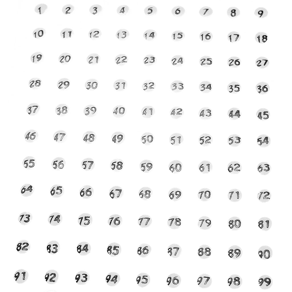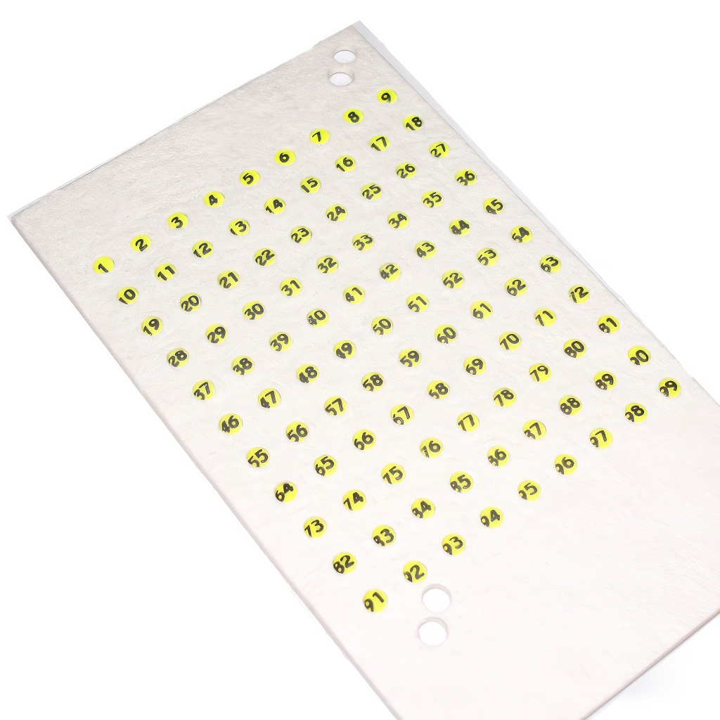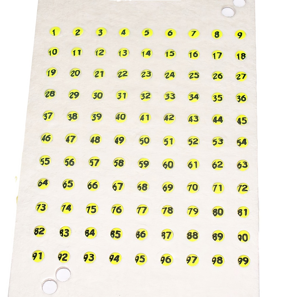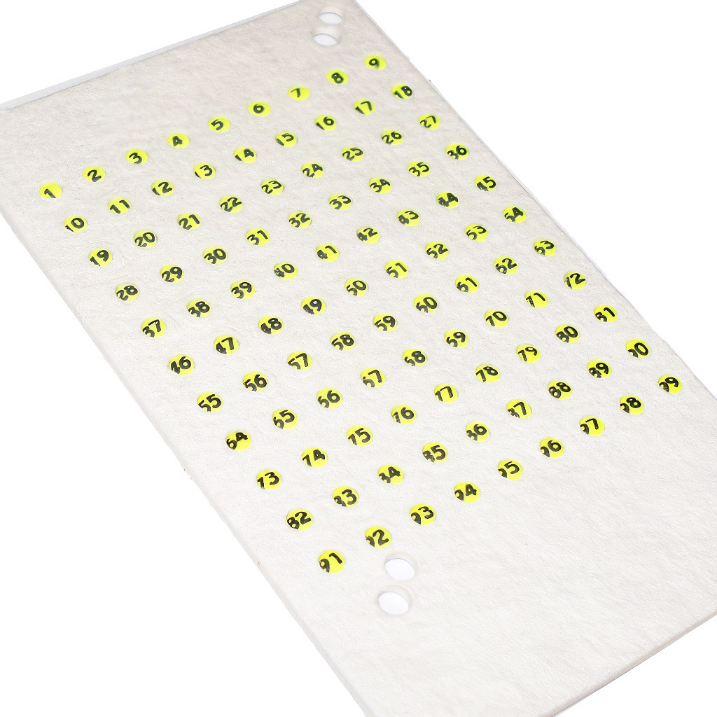 Moderne Art der Königinnenzeichnung. Kleine Plättchen mit aufgedruckten Zahlen in farbigem Dekor, das dem entsprechenden Jahr zugeordnet ist. Jede Packung enthält einen Satz Zahlen von 1 bis 99. Am Körper der Königin werden sie mit Hilfe von Acetonfarbe (Celox, Nicel) oder unter Verwendung von Nagellack befestigt. Auf keinen Fall dürfen zur Kennzeichnung Sekundenkleber verwendet werden. Diese Plättchen wurden getestet und stammen aus dem Bienenforschungsinstitut in Dol.