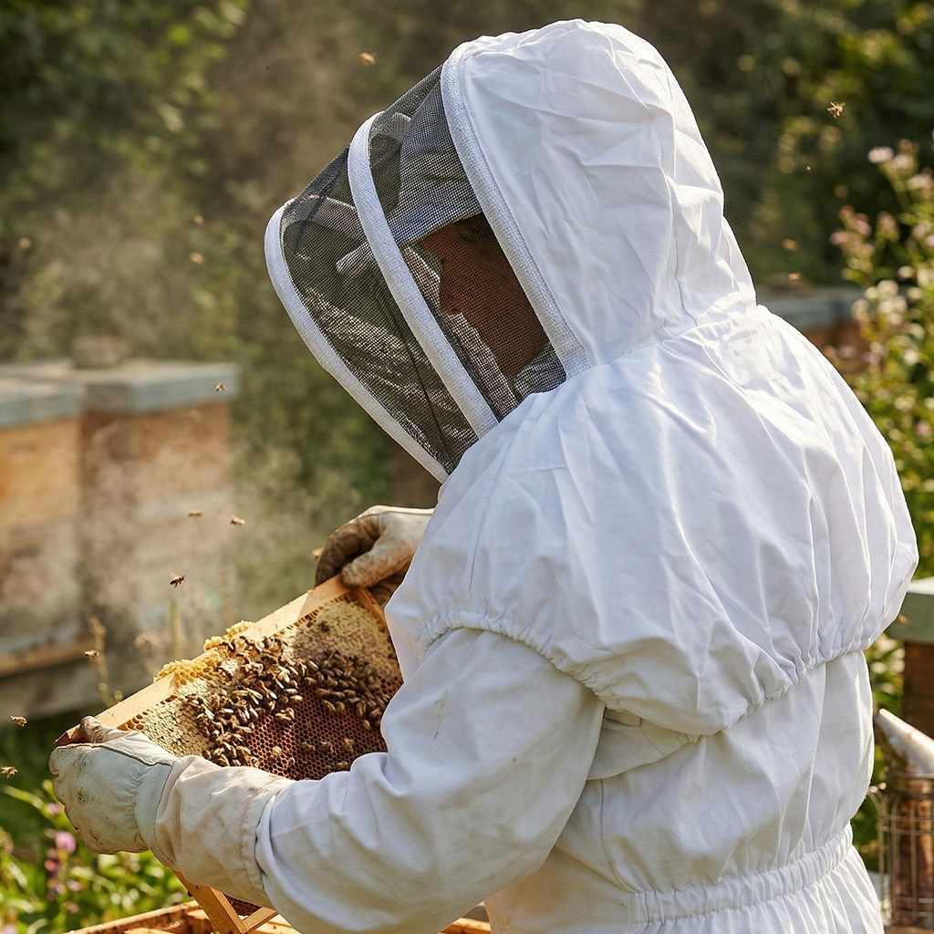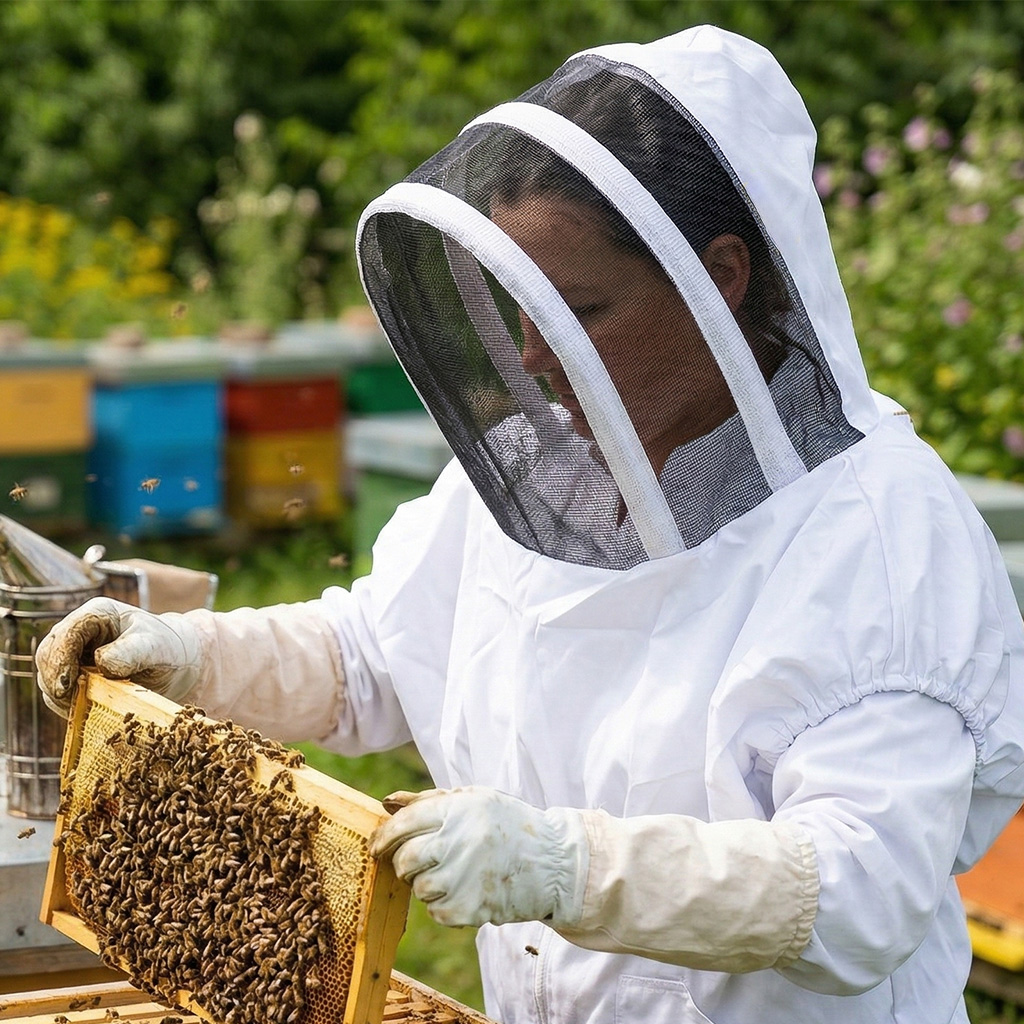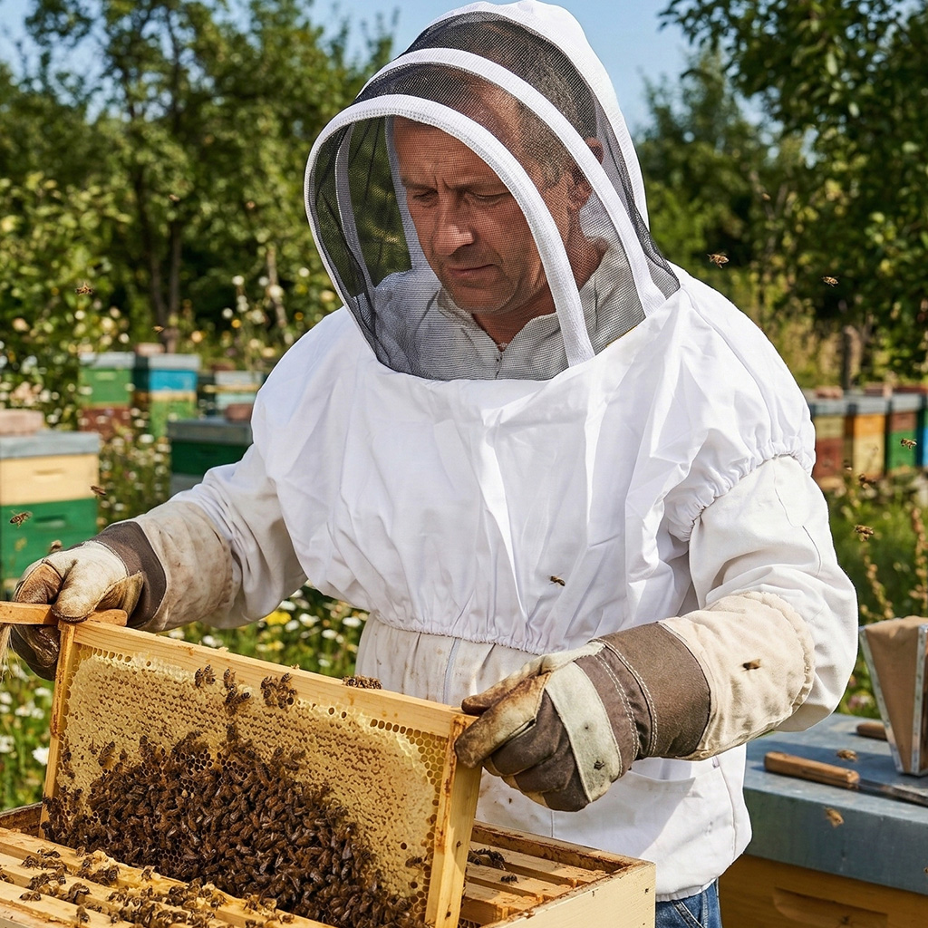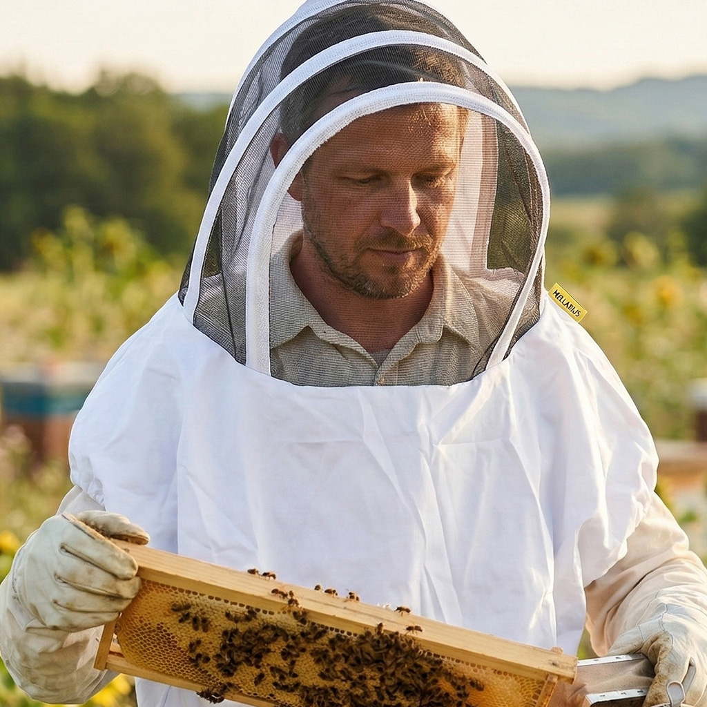 Imkerhaube Mellarius mit Baumwollgewebe. Beliebte, preisgünstige Imkerhaube (Hut) mit festem, widerstandsfähigem Schleier. Der schwarze Schleier gewährleistet gute Sicht, der breite Krempenrand garantiert sicheren Abstand aller Kopfteile vom Schleier.