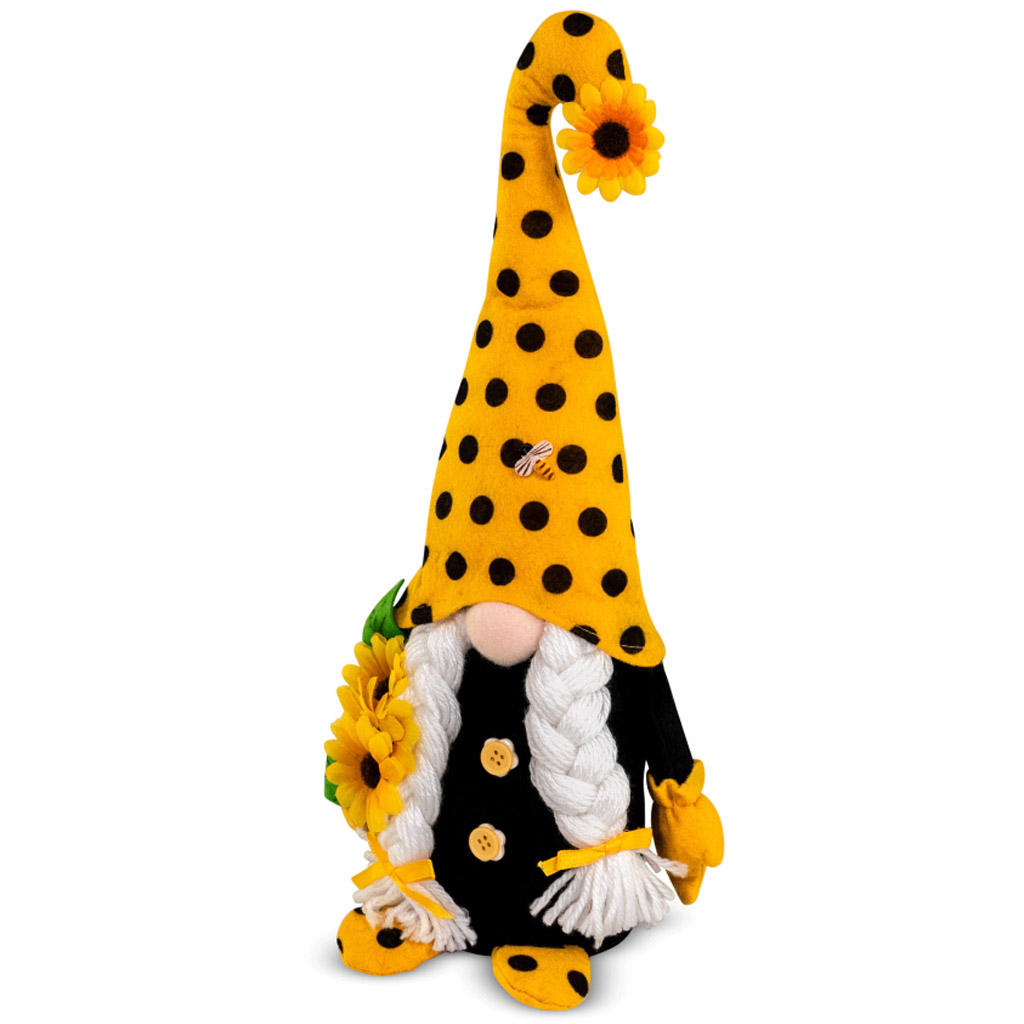 Die Figur ist aus angenehm weichem Plüsch gefertigt und mit textilen sowie filzigen Elementen ergänzt. Blickfang sind der lange gestrickte Bart, die schwarz‑gelbe Mütze im Bienenstil und die Sonnenblume in den Händen – ein sommerliches Symbol voller Pollen und Leben am Bienenstand.