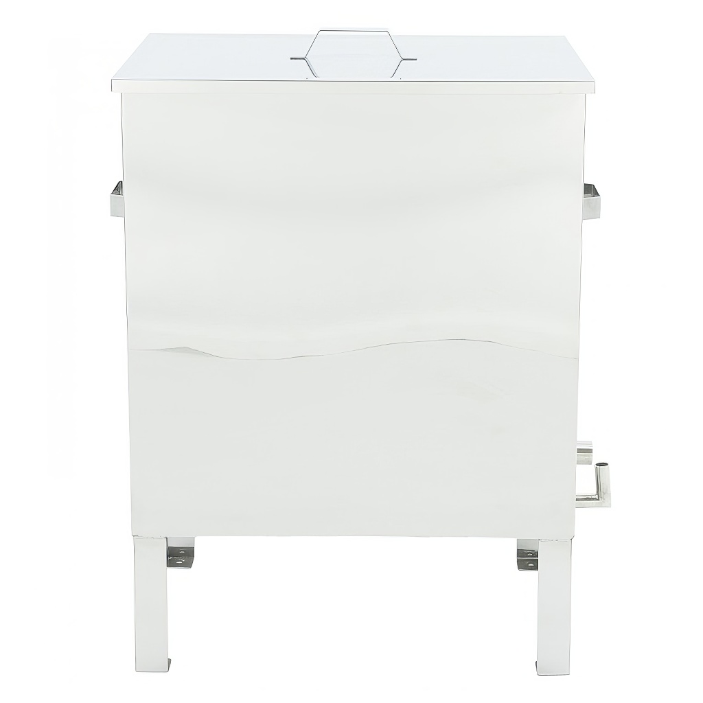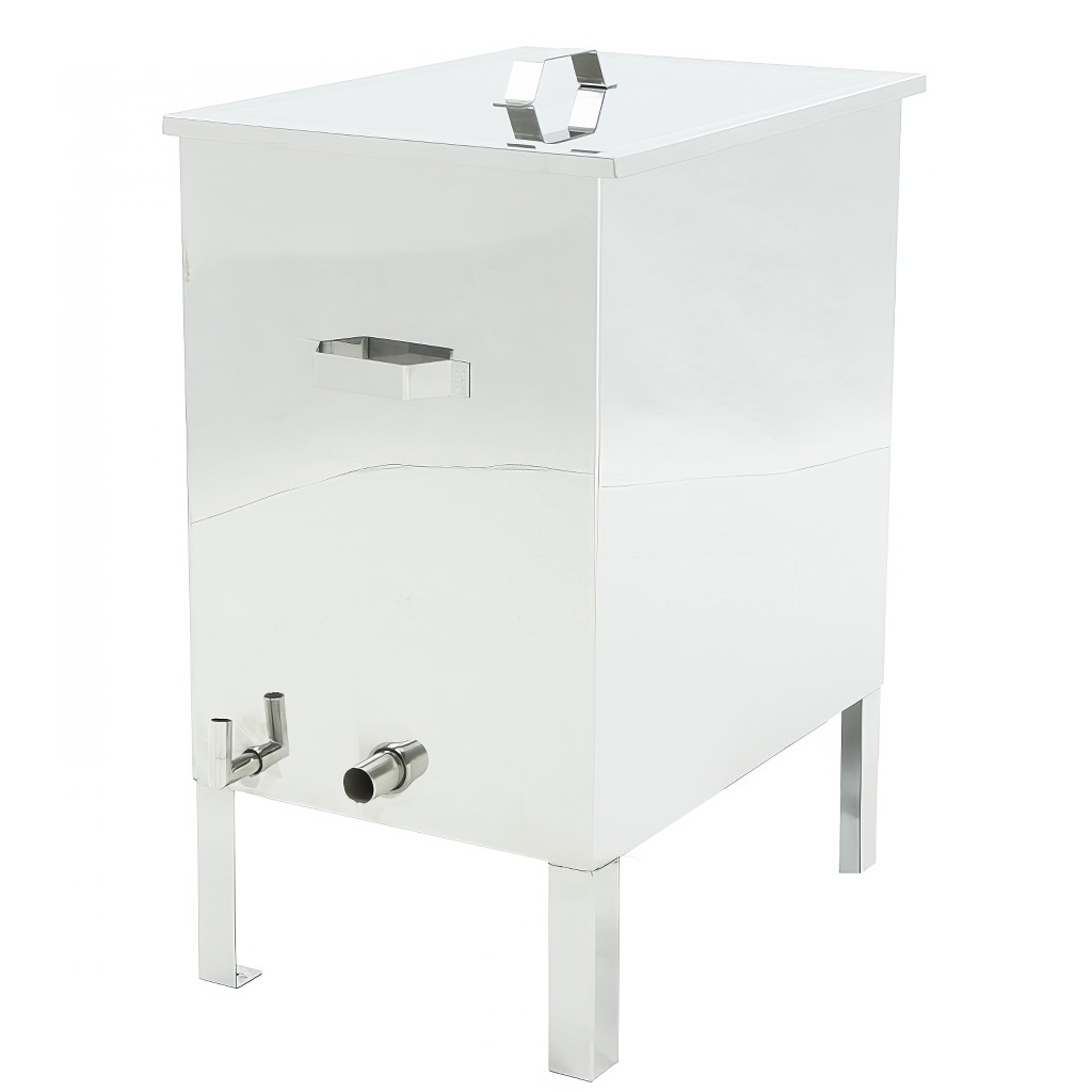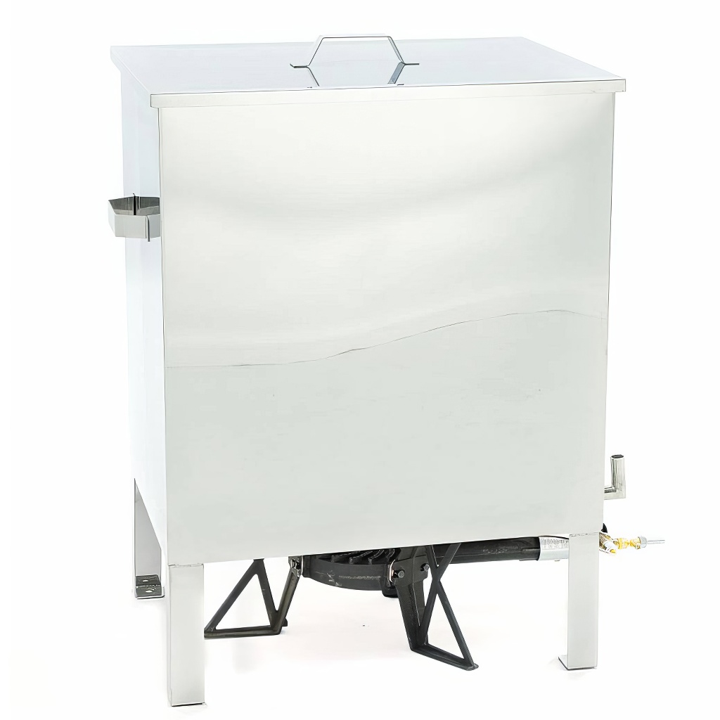 Der Edelstahl-Wachskocher besteht aus einem inneren Behälter, in dem sich Wasser befindet, und einem Korb, in den die Rähmchen oder Waben eingelegt werden. Ein separater Bestandteil des Wachskochers ist der Gasbrenner, mit dem durch Erhitzen des Tanks Dampf erzeugt wird. Der Edelstahl-Wachskocher kann auch auf einem Ofen oder einer anderen Feuerstelle unter Beachtung der Sicherheit verwendet werden.