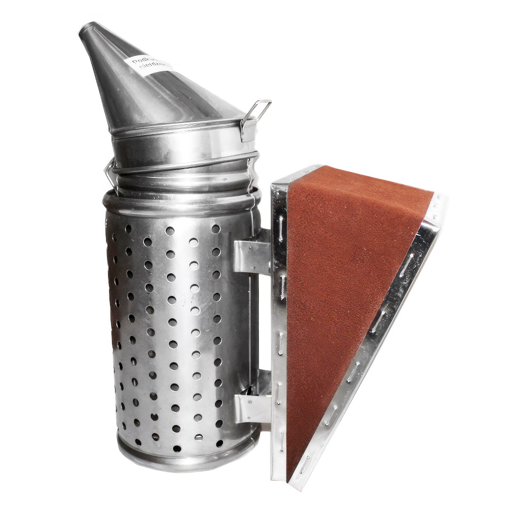 Großer Imker-Edelstahl-Smoker mit Einsatz ist aus hochwertiger Edelstahllegierung gefertigt. Der Imker-Edelstahl-Smoker mit Lederblasebalg ist ein sehr wichtiges Imkereiwerkzeug. Der Rauch aus dem Smoker beruhigt nämlich die Bienen. Die Bienen bleiben dann auf der Wabe und sind viel weniger aggressiv. Der Smoker dient also auch zum sicheren Vertreiben der Bienen aus Teilen der Beuten, wo Sie arbeiten möchten. Der Imker-Smoker hat eine praktische Form mit ausreichend schmalem Hals, um fast überall hinzukommen. Als Brennmaterial können entweder hausgemachte Präparate oder speziell hergestellte Dochte dienen. Traditionell verwenden Imker im Smoker trockenes morsches Holz, das Sie in jedem Wald finden. Der im Smoker entstehende Rauch wird mit Hilfe des Blasebalgs durch den Schornstein über den Funkenfänger ausgetrieben. Der Smoker dient nicht nur zur Beruhigung der Bienen. Für den Smoker ist auch der Nachkauf eines Ersatzblasebalgs möglich. Der Imker-Smoker ist ein unentbehrliches Imkereiwerkzeug.