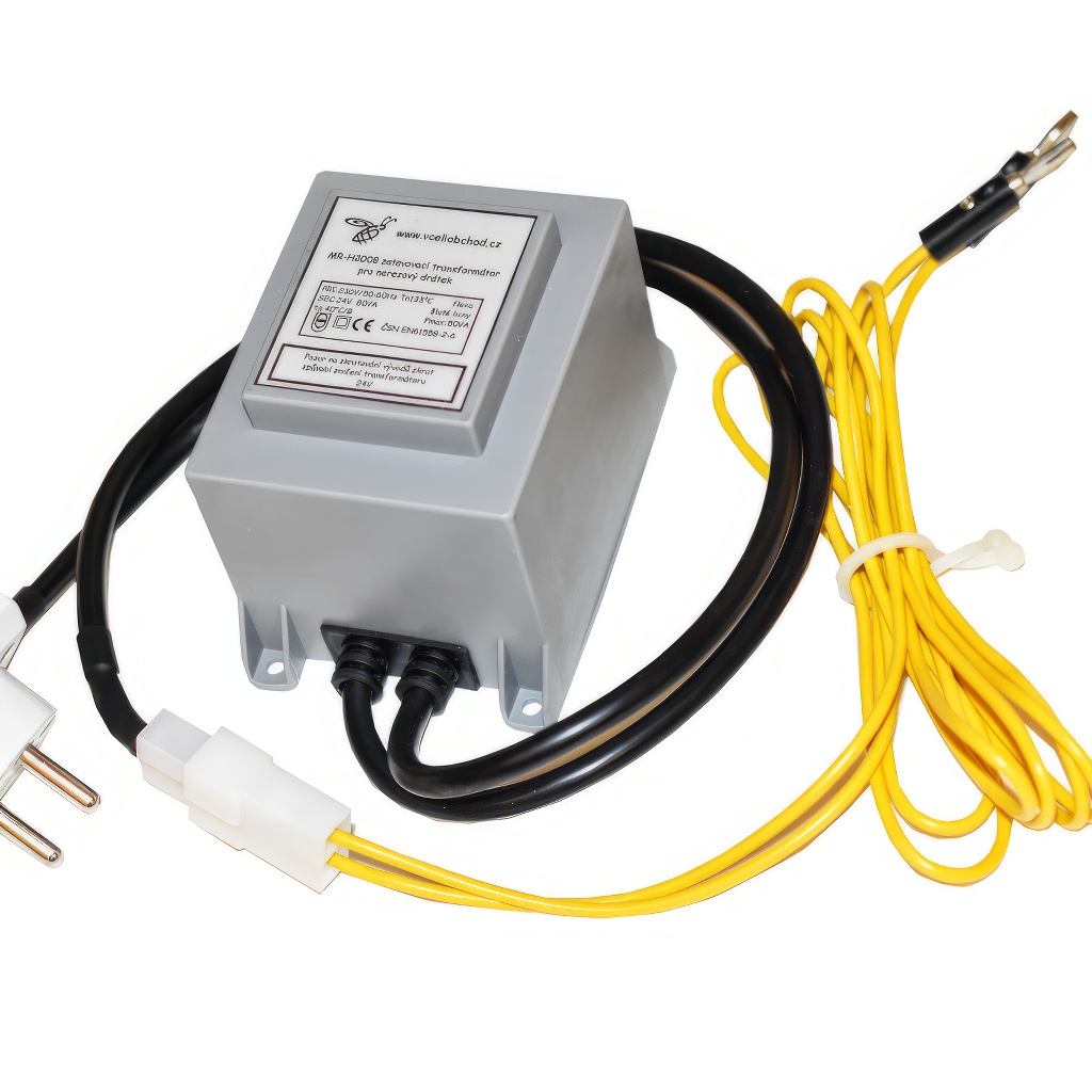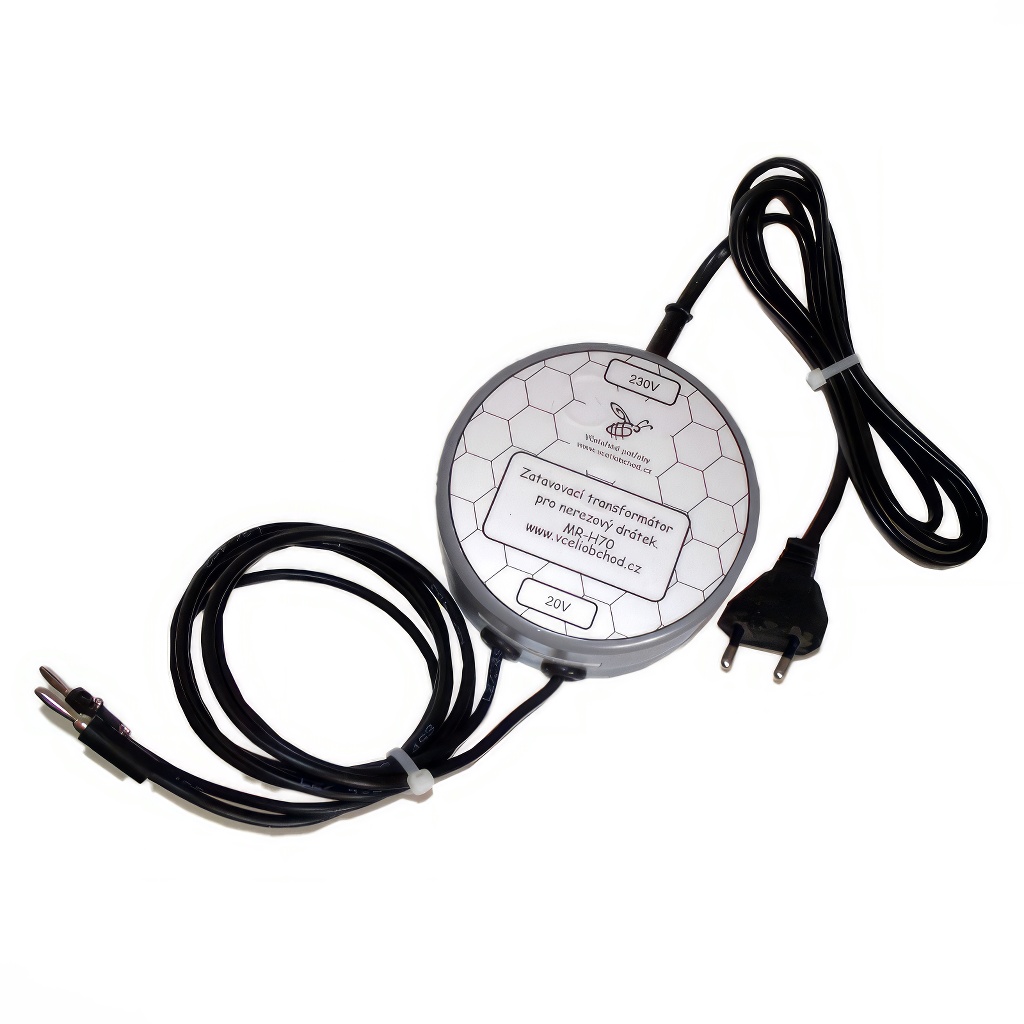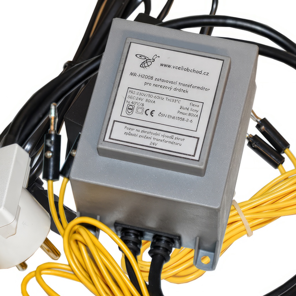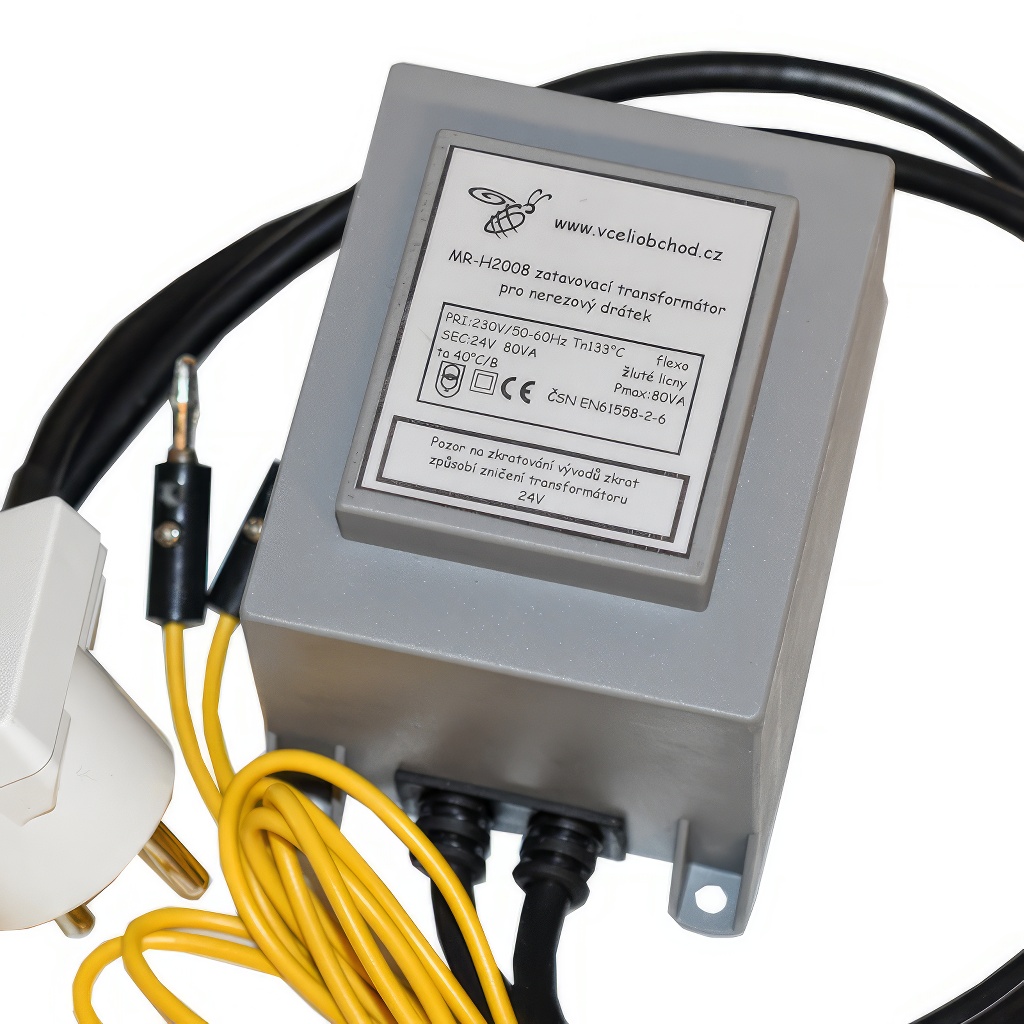 Einschmelztrafo zum Einschmelzen von Edelstahldraht in Mittelwände - (Einschmelzgerät). Ausgang 24 V, 80 VA. Die Bespannung des Bienenrähmchens sollte idealerweise mit einem Wellgerät gespannt werden. Der Draht wird dann gewellt und verkürzt, bleibt aber dennoch elastisch. Die Mittelwände werden an die Drähte zur unteren Leiste angelegt und den Spalt oben schließen die Bienen immer, während unten nur schwer. An die Drahtenden werden die Kontakte des sogenannten Einschmelztrafos (24 V) angelegt und die Drähte erwärmen sich durch den Widerstand und gleiten in das Wachs der Mittelwand. In diesem Moment ist es notwendig, die Trafokontakte von den Drahtenden zu entfernen. Sie müssen keine Unterlage verwenden. Sobald Sie es einige Male ausprobiert haben, bekommen Sie ein Gefühl und eine Einschätzung dafür, wann die Kontakte zu trennen sind, damit die Mittelwand nicht durchschmilzt.