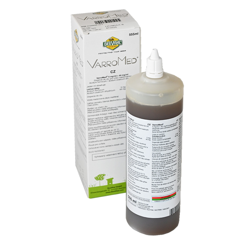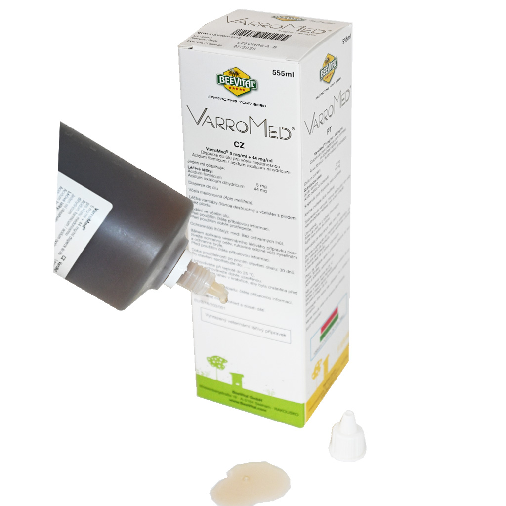 VarroMed® ist gebrauchsfertig, einfach und leicht in den Bienenstock anwendbar ohne jegliche Vorbereitungen. Wir bieten dem Imker drei und mehr Möglichkeiten, wann VarroMed® zur Behandlung der Bienenvölker verwendet werden kann, d.h. Frühjahr + Spätsommer/Herbst + Winter. Dieses innovative Produkt wird in einer 555 ml Flasche mit Tropfer und praktischer Skala für einfache Anwendung geliefert. VarroMed® ist zur sofortigen Anwendung bereit und besteht aus natürlichen Substanzen in Kombination mit zwei Wirkstoffen – Ameisensäure und Oxalsäure. Das Präparat hat keine Wartezeit und ist auch für die Bio-Imkerei geeignet. VarroMed® wird zur Bekämpfung der Varroose in Bienenvölkern mit und ohne Brut im Frühjahr, Spätsommer, Herbst und Winter verwendet. Das Präparat ist speziell für eine einfache und schnelle Behandlung der Bienen entwickelt. VarroMed® ist in allen EU-Ländern rezeptfrei erhältlich.