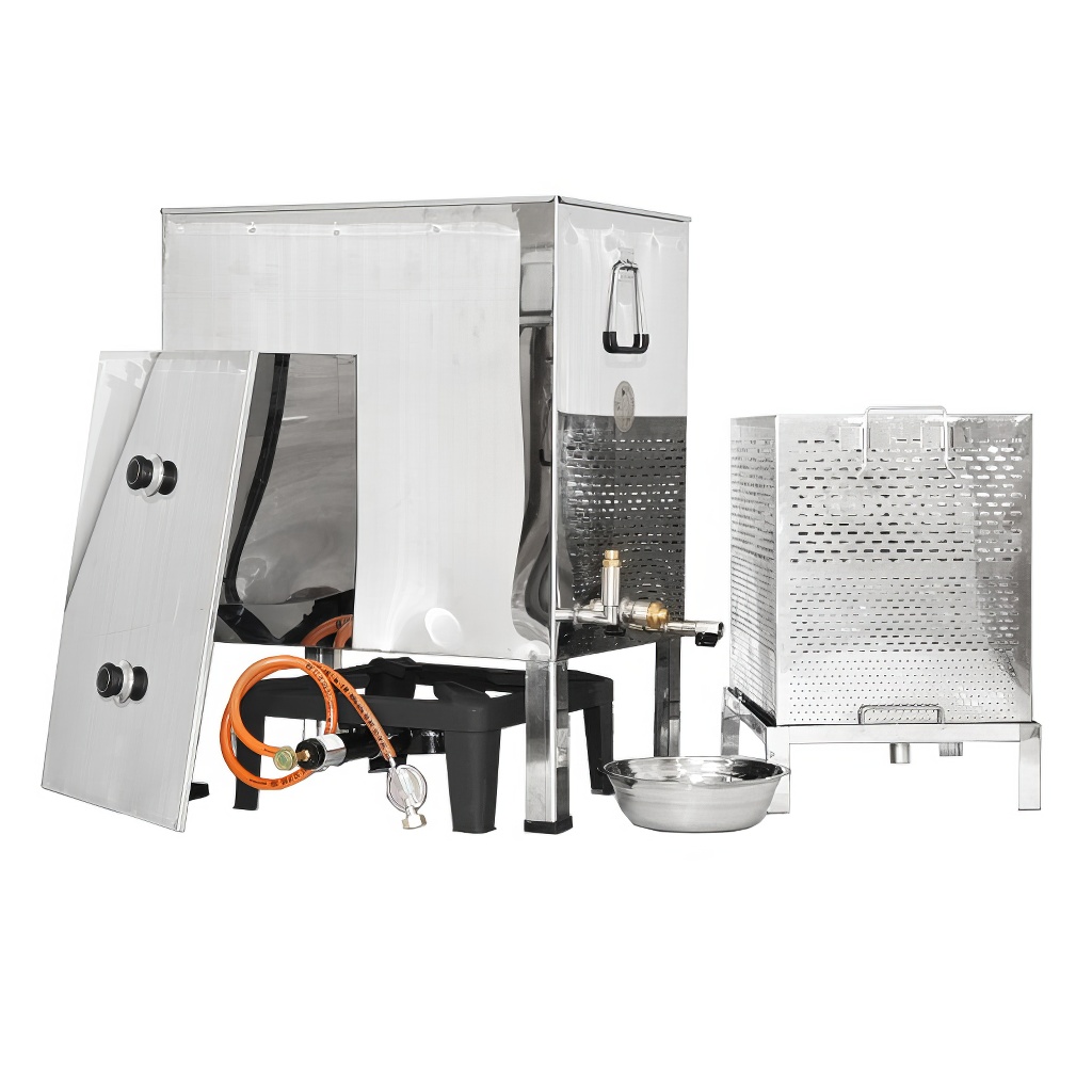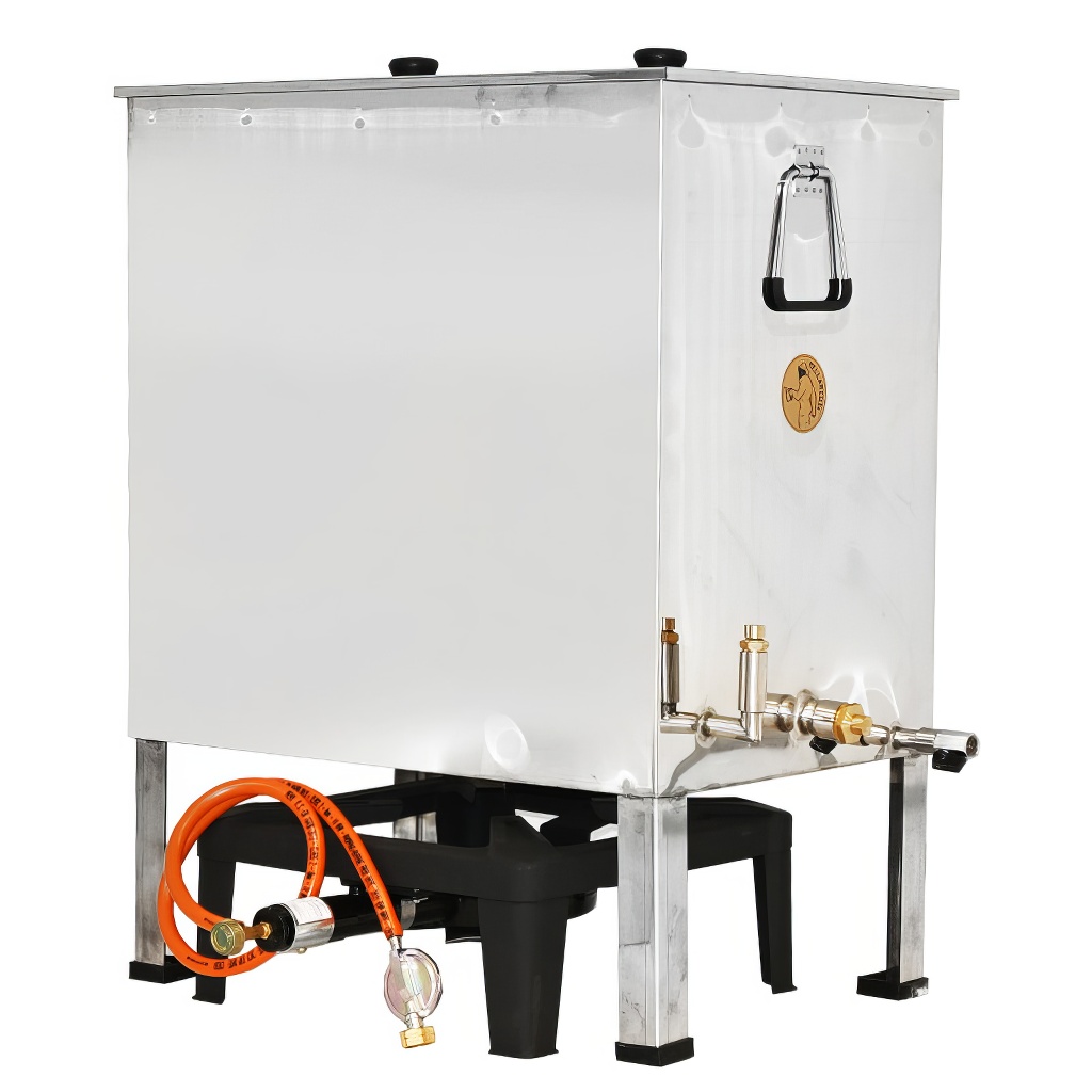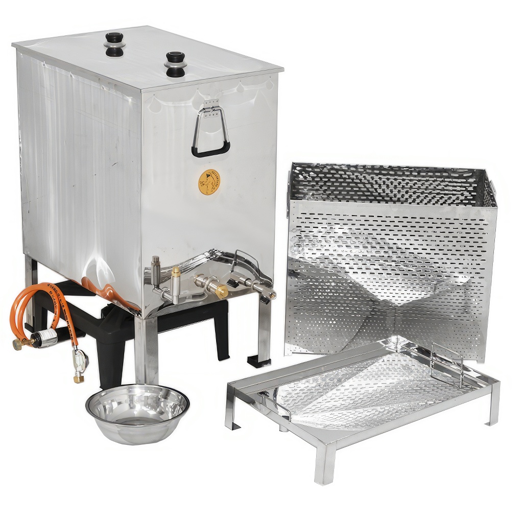 Hochwertiger großer Wachsschmelzer für einfaches und schnelles Ausschmelzen von Wachs aus Rähmchen und Waben mittels Wasserdampf, der sowohl mit einem Dampferzeuger als auch mit einem Gasbrenner erhitzt werden kann. Der Dampf-Edelstahl-Wachsschmelzer besteht aus einem Wassertank und einem Korb für Rähmchen oder Waben. Der Schmelzer hat ein stabiles 4-Bein-Gestell und einen Rähmchenkorb mit Griffen. Das Wasser fließt durch eine eigene Ablauföffnung ab und das Wachs ebenfalls.